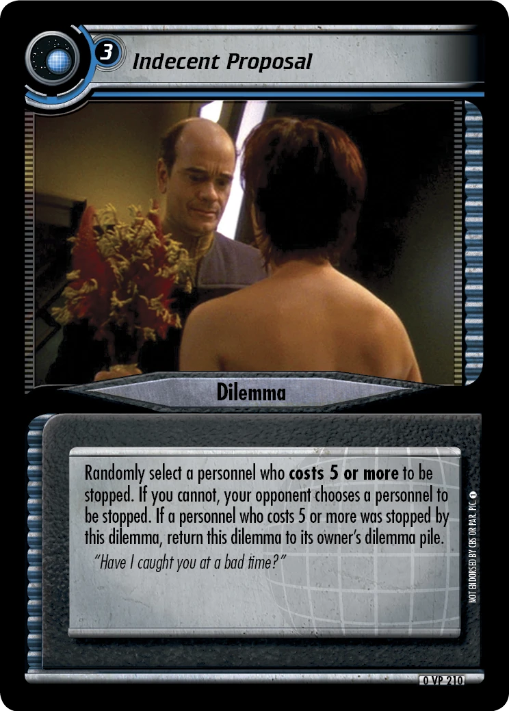 | Game Text | Randomly select a personnel who costs 5 or more to be stopped. If you cannot, your opponent chooses a personnel to be stopped. If a personnel who costs 5 or more was stopped by this dilemma, return this dilemma to its owner's dilemma pile. |
