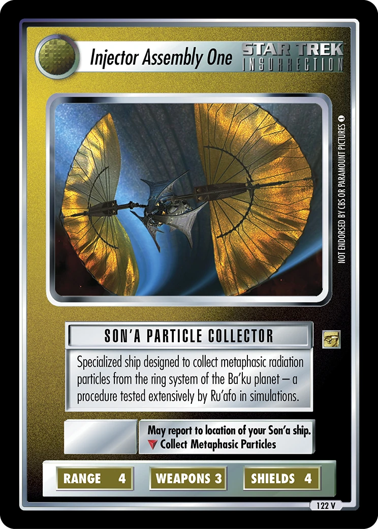| Lore | Specialized ship designed to collect metaphasic radiation particles from the ring system of the Ba'ku planet – a procedure tested extensively by Ru'afo in simulations. |