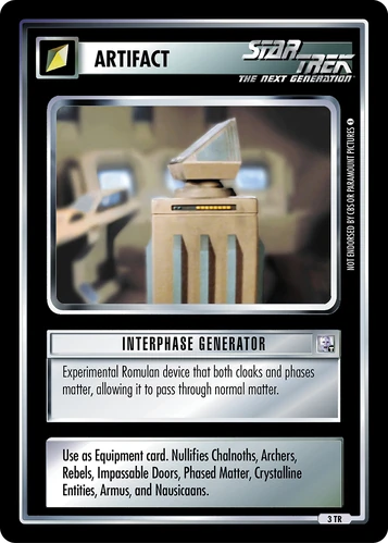 | Game Text | Use as Equipment card. Nullifies: Chalnoths, Archers, Rebels, Impassable Doors, Phased Matter, Crystalline Entities, Armus and Nausicaans. |