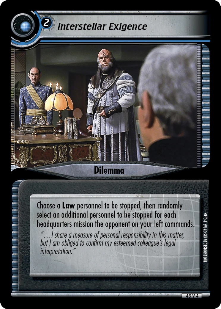| Lore | "...I share a measure of personal responsibility in this matter, but I am obliged to confirm my esteemed colleague's legal interpretation." |