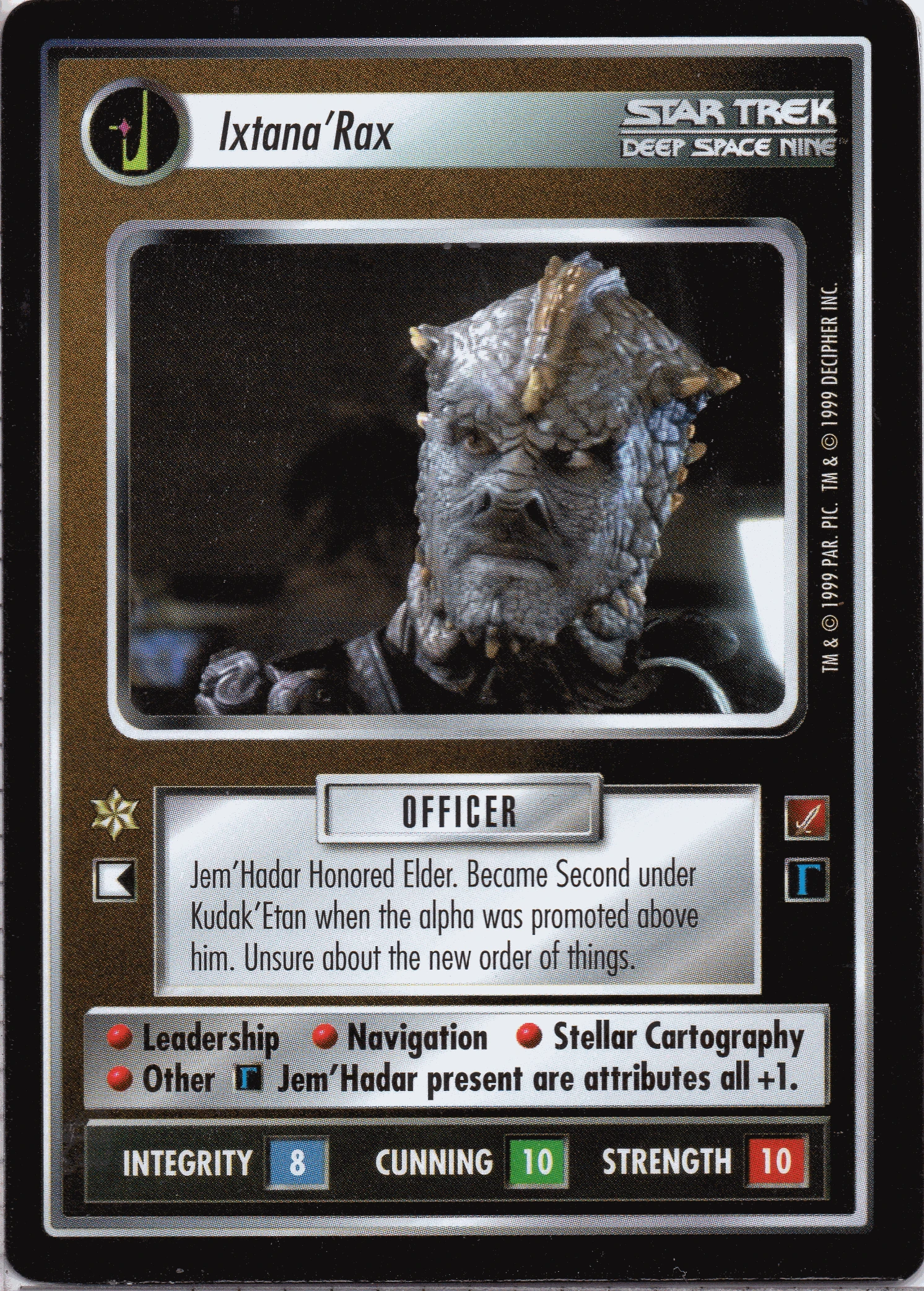 | Lore | Jem'Hadar Honored Elder. Became Second under Kudak'Etan when the alpha was promoted above him. Unsure about the new order of things. |
