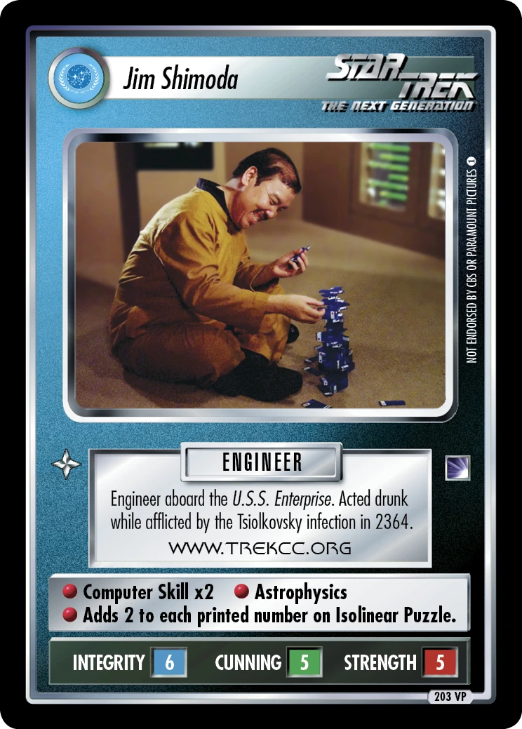 | Lore | Engineer aboard the U.S.S. Enterprise. Acted drunk while afflicted by the Tsiolkovsky infection in 2364. WWW.TREKCC.ORG |
