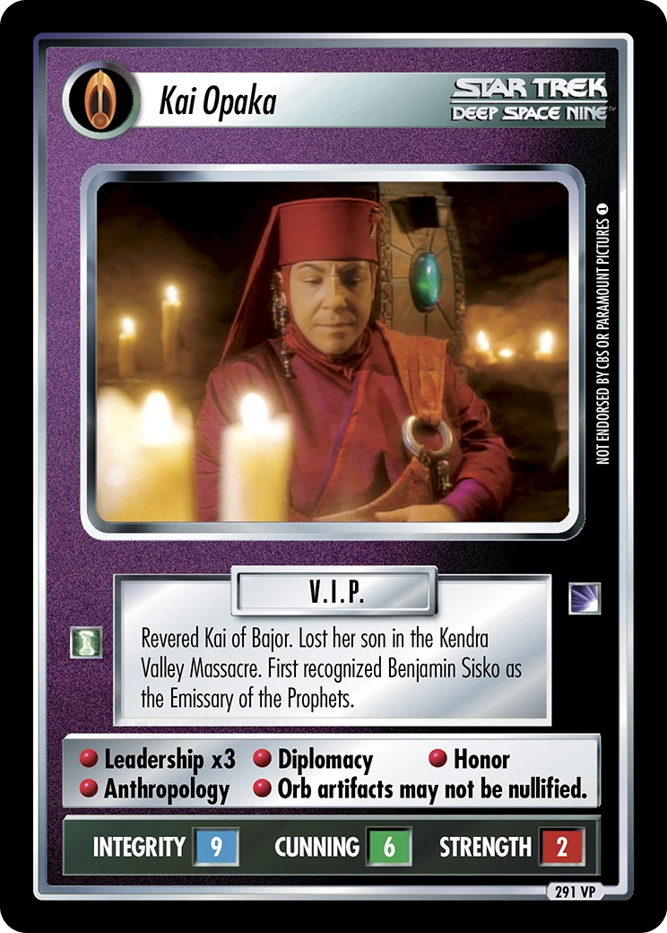 | Lore | Revered Kai of Bajor. Lost her son in the Kendra Valley Massacre. First recognized Benjamin Sisko as the Emissary of the Prophets. |