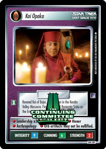 | Lore | Revered Kai of Bajor. Lost her son in the Kendra Valley Massacre. First recognized Benjamin Sisko as the Emissary of the Prophets. |