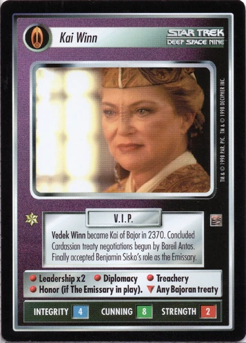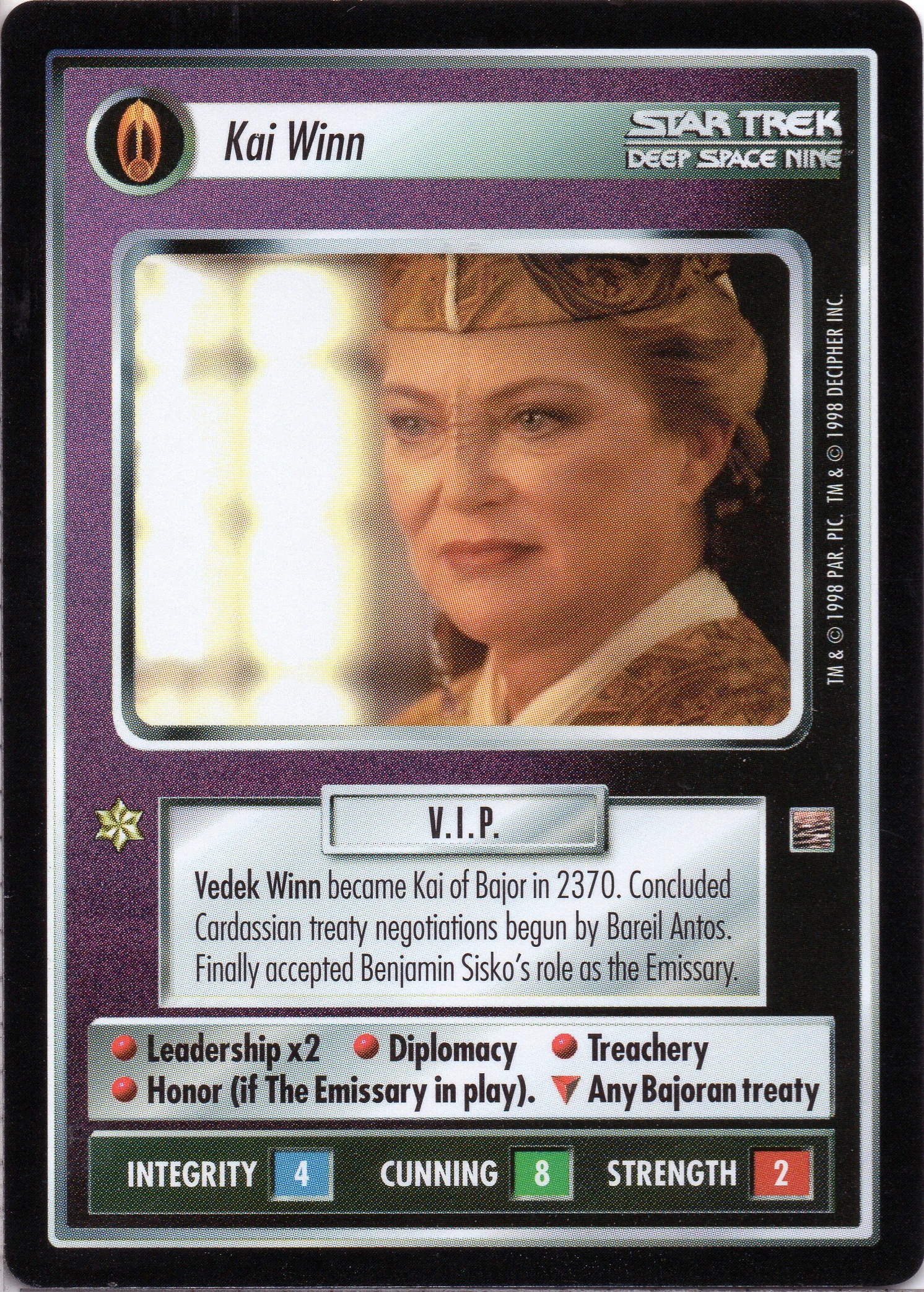 | Lore | Vedek Winn became Kai of Bajor in 2370. Concluded Cardassian treaty negotiations begun by Bareil Antos. Finally accepted Benjamin Sisko's role as the Emissary. |