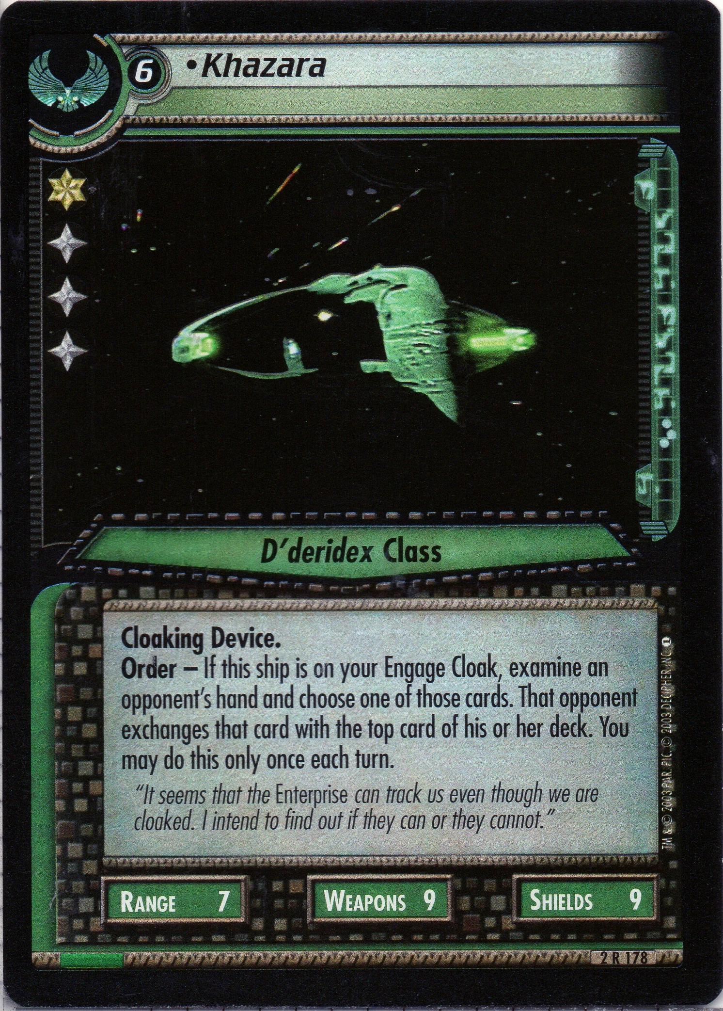 | Game Text | Order – If this ship is on your Engage Cloak, examine an opponent's hand and choose one of those cards. That opponent exchanges that card with the top card of his or her deck. You may do this only once each turn. |