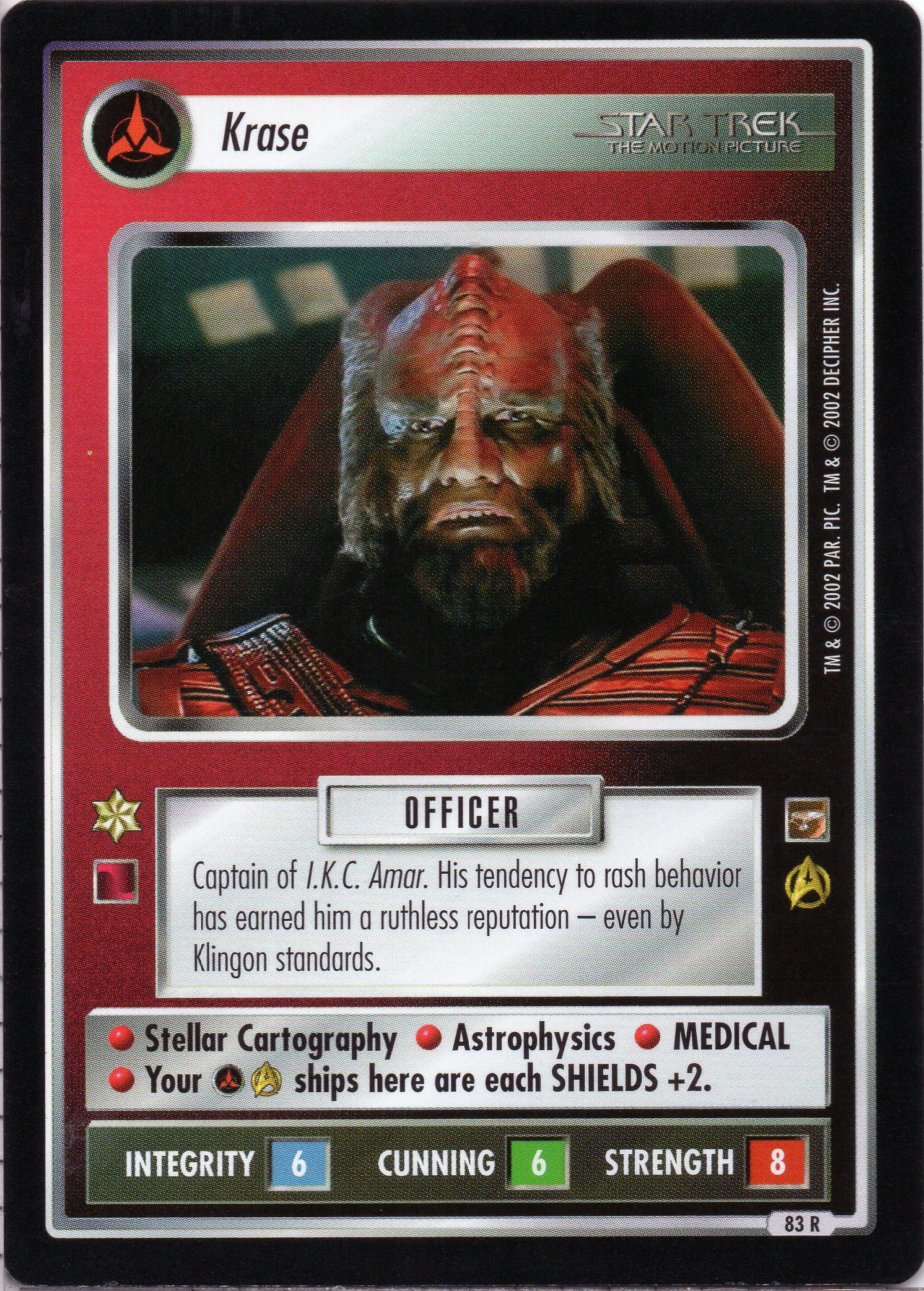 | TRIVIA | Card Title - Character was unnamed in the movie. "Krase" is an anagram of "Sarek" - a character also played by actor Marc Lenard. |