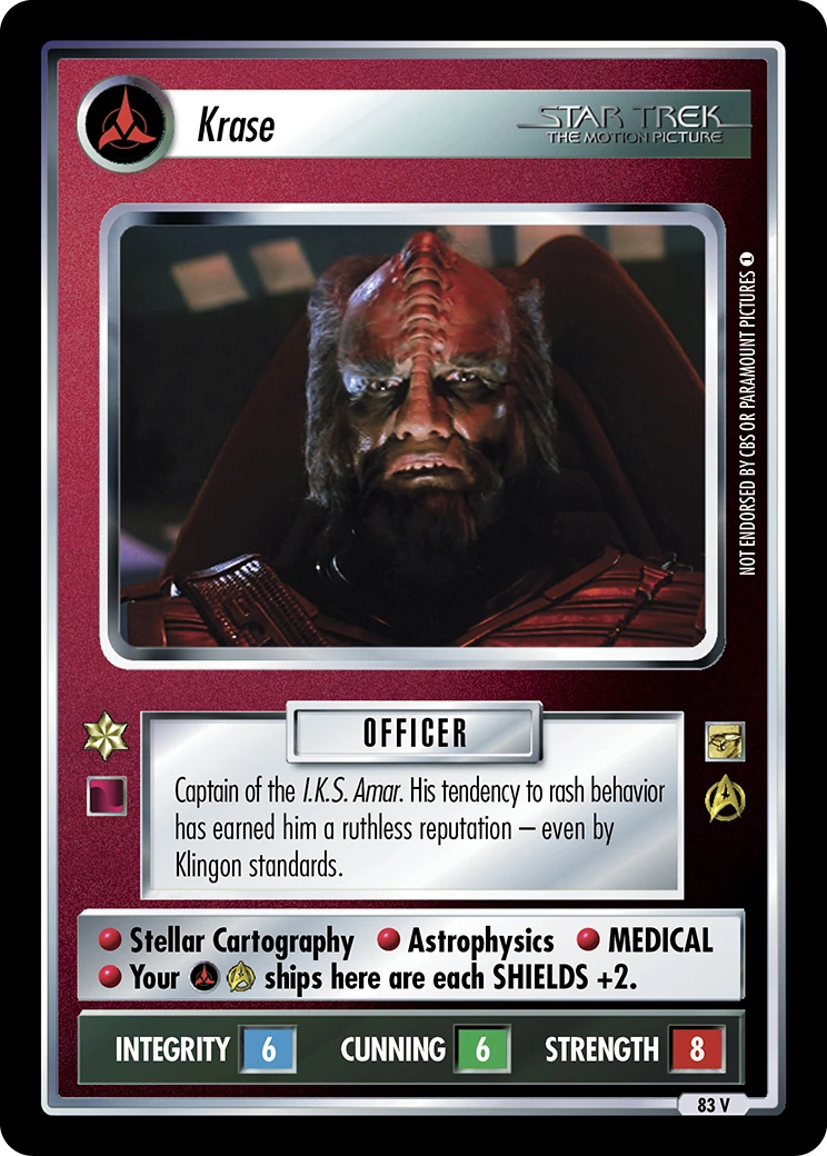 | TRIVIA | Card Title - Character was unnamed in the movie. "Krase" is an anagram of "Sarek" - a character also played by actor Marc Lenard. |
