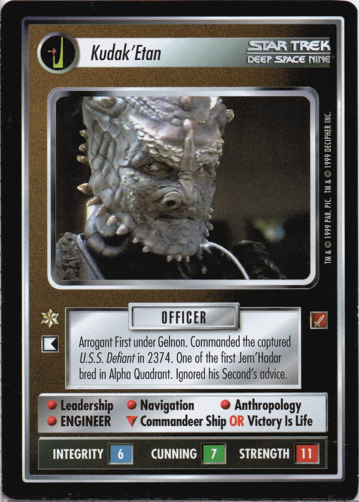 | Lore | Arrogant First under Gelnon. Commanded the captured U.S.S. Defiant in 2374. One of the first Jem'Hadar bred in Alpha Quadrant. Ignored his Second's advice. |