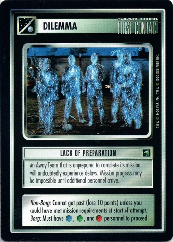 | Resolution Guide | If you are playing a non-Borg affiliation: If Away Team/crew meets conditions (included all mission requirements at start of current mission attempt), discard dilemma; mission continues. If not, Away Team/ship and crew are stopped; lose 10 points; replace dilemma under mission to be encountered again. (You may not use a non- Borg-affiliation personnel with Borg subcommand icons, such as Seven of Nine, to pass this dilemma.) If you are playing Borg affiliation: If Away Team/crew meets conditions ([Com], [Nav] and [Def] icons, on one or more personnel), discard dilemma; scouting continues. If not, Away Team/ship and crew are stopped; replace dilemma under mission to be encountered again. |