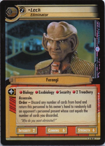 | Game Text | Order – Discard any number of cards from hand and return this personnel to his owner's hand to randomly kill an opponent's personnel present whose cost equals the number of cards you discarded. |