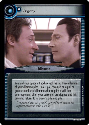 | Game Text (Errata) | You and your opponent each reveal the top three dilemmas of your dilemma piles. Unless you reveal an equal or greater number of dilemmas that require a skill than your opponent, all of your personnel are stopped and this dilemma returns to its owner's dilemma pile. |