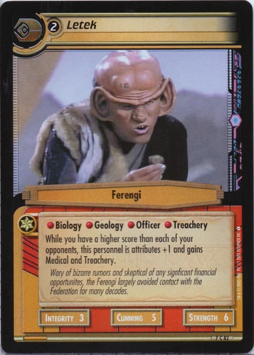 | Lore | Wary of bizarre rumors and skeptical of any significant financial opportunities, the Ferengi largely avoided contact with the Federation for many decades. |