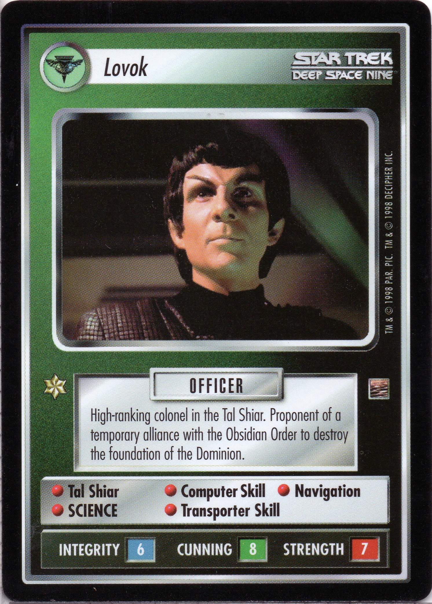 | Lore | High-ranking colonel in the Tal Shiar. Proponent of a temporary alliance with the Obsidian Order to destroy the foundation of the Dominion. |