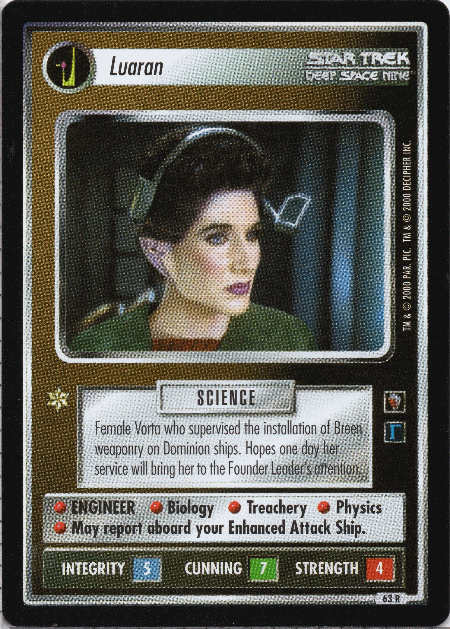 | Lore | Female Vorta who supervised the installation of Breen weaponry on Dominion ships. Hopes one day her service will bring her to the Founder Leader's attention. |