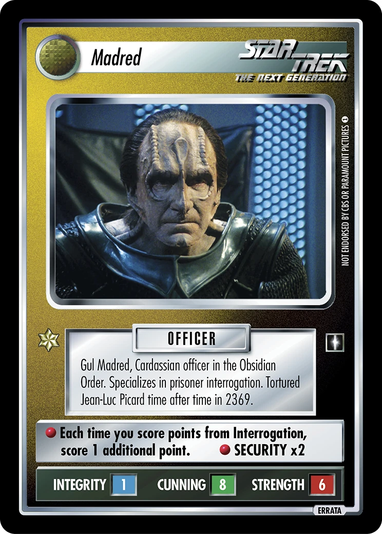 | Lore | Gul Madred, Cardassian officer in the Obsidian Order. Specializes in prisoner interrogation. Tortured Jean-Luc Picard time after time in 2369. |