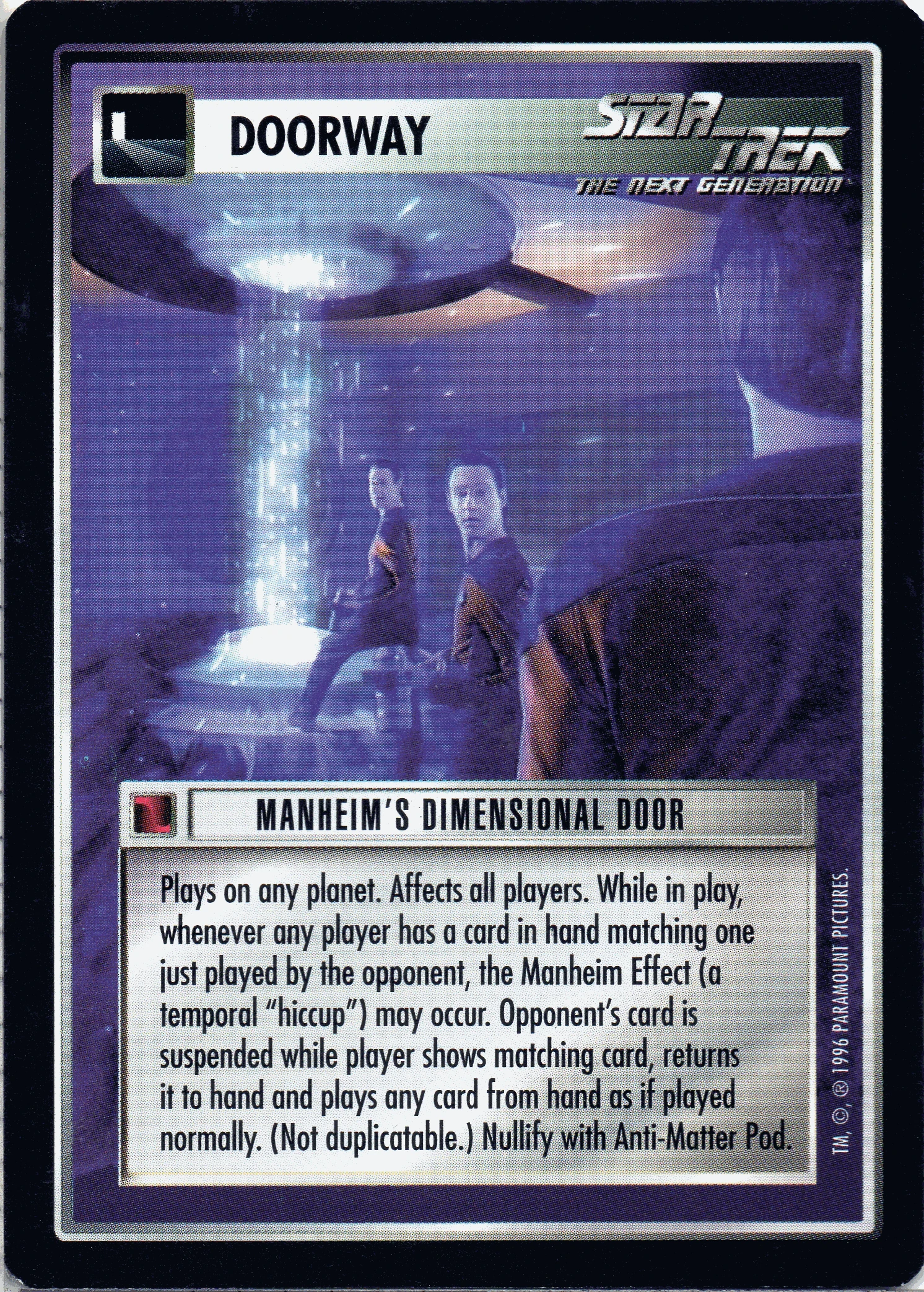 | Game Text | Plays on any planet. Affects all players. While in play, whenever any player has a card in hand matching one just played by the opponent, the Manheim Effect (a temporal "hiccup") may occur. Opponent's card is suspended while player shows matching card, returns it to hand and plays any card from hand as if played normally. (Not duplicatable.) Nullify with Anti-Matter Pod. |