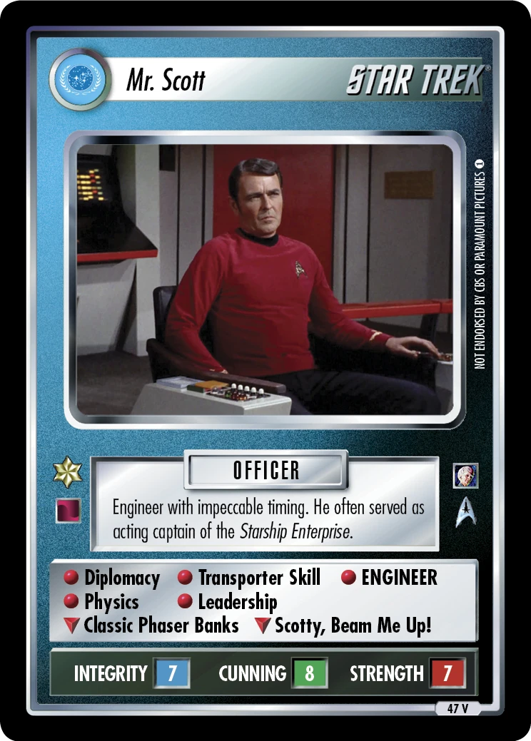 | Lore (Errata) | Engineer with impeccable timing. He often served as acting captain of the Starship Enterprise. |