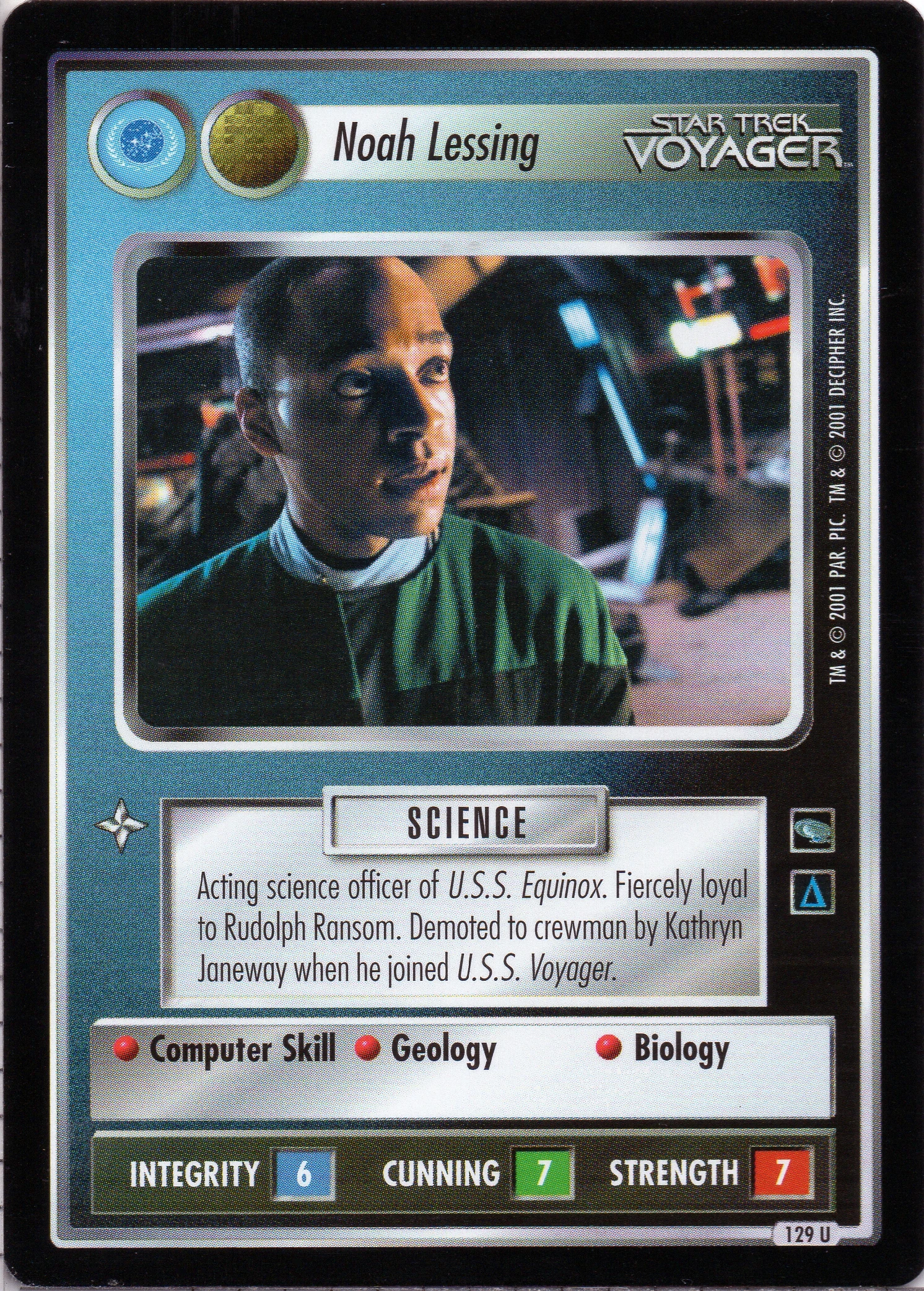 | Lore | Acting science officer of U.S.S. Equinox. Fiercely loyal to Rudolph Ransom. Demoted to crewman by Kathryn Janeway when he joined U.S.S. Voyager. |