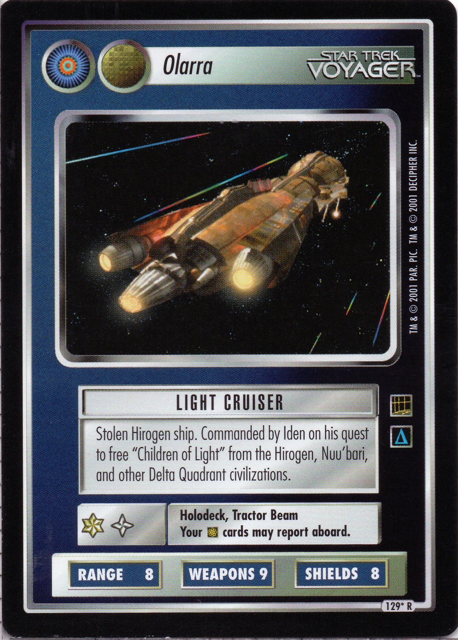 | Lore | Stolen Hirogen ship. Commanded by Iden on his quest to free "Children of Light" from the Hirogen, Nuu'bari and other Delta Quadrant civilizations. |