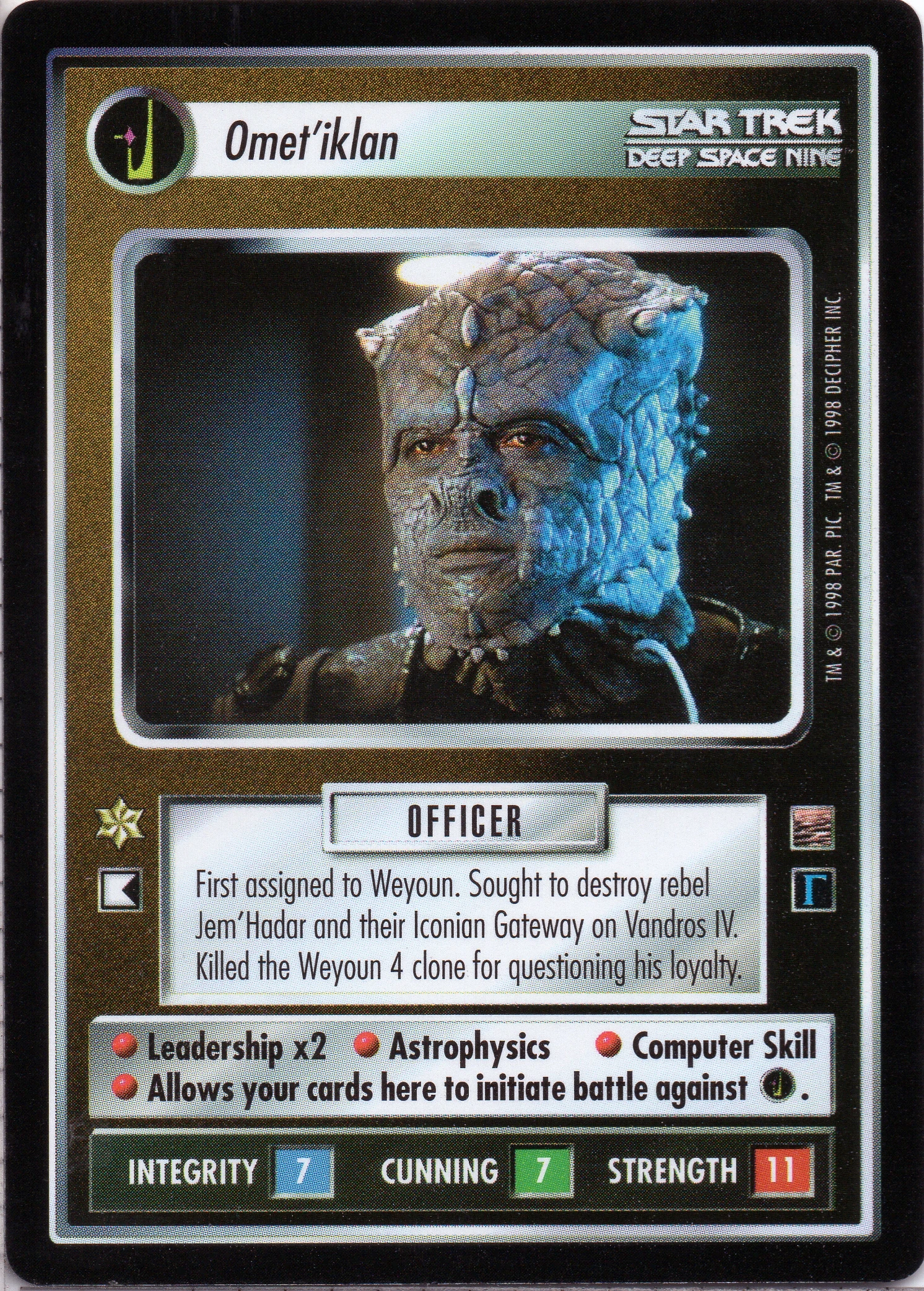 | Lore | First assigned to Weyoun. Sought to destroy rebel Jem'Hadar and their Iconian Gateway on Vandros IV. Killed the Weyoun 4 clone for questioning his loyalty. |