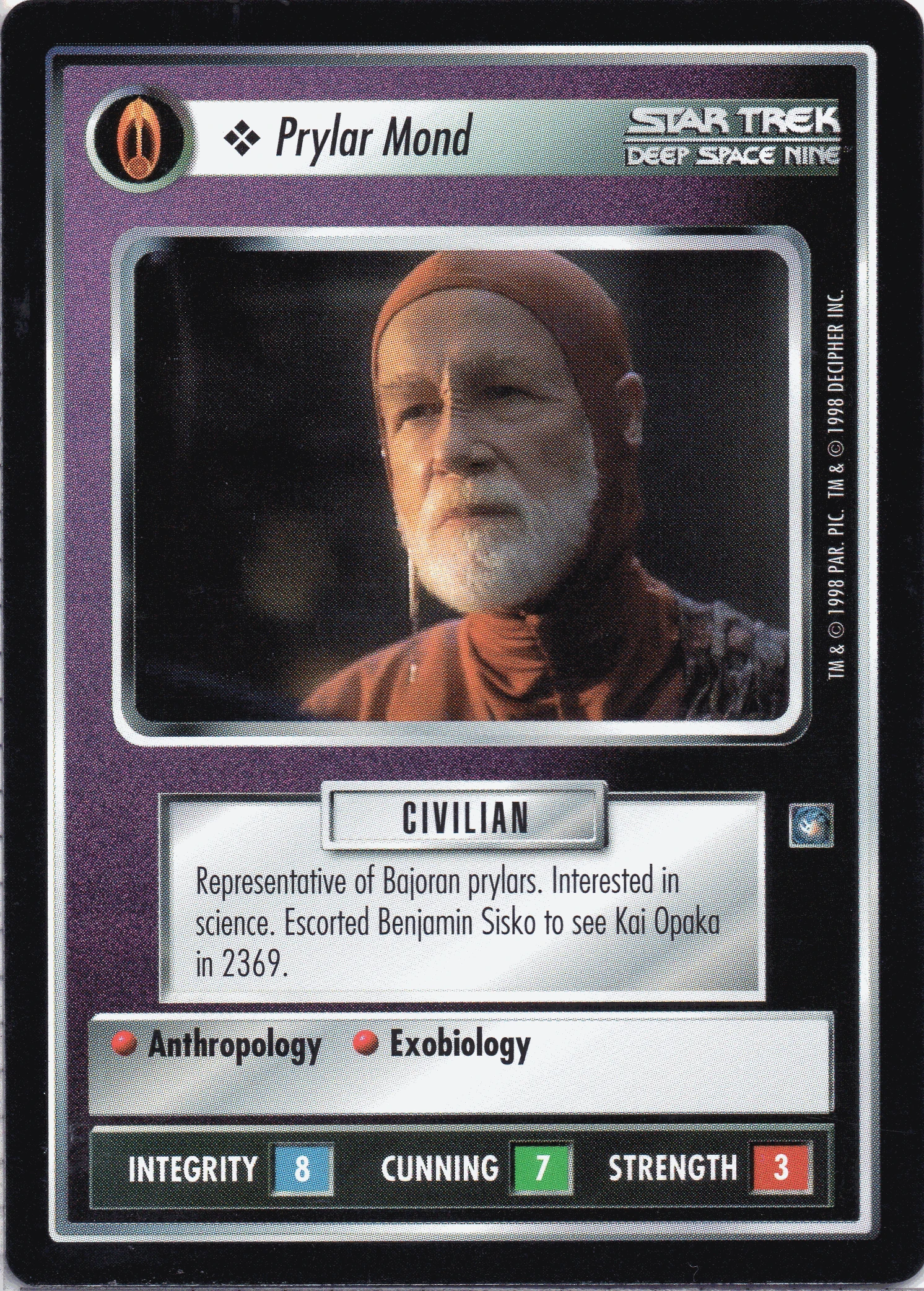 | Lore | Representative of Bajoran prylars. Interested in science. Escorted Benjamin Sisko to see Kai Opaka in 2369. |
