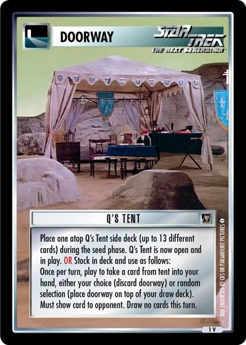 | Game Text (Errata) | Place one atop Q's Tent side deck (up to 13 different cards) during the seed phase. Q's Tent is now open and in play. OR Stock in deck and use as follows: Once per turn, play to take a card from tent into your hand, either your choice (discard doorway) or random selection (place doorway on top of your draw deck). Must show card to opponent. Draw no cards this turn. |