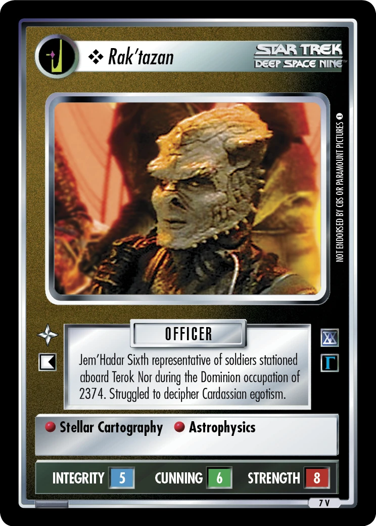| Lore | Jem'Hadar Sixth representative of soldiers stationed aboard Terok Nor during the Dominion occupation of 2374. Struggled to decipher Cardassian egotism. |