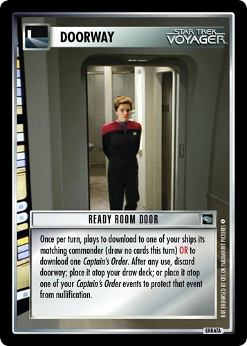 | Game Text | Once per turn, plays to download to one of your ships its matching commander (draw no cards this turn) OR to download one Captain's Order. After any use, discard doorway; place it atop your draw deck; or place it atop one of your Captain's Order events to protect that event from nullification. |