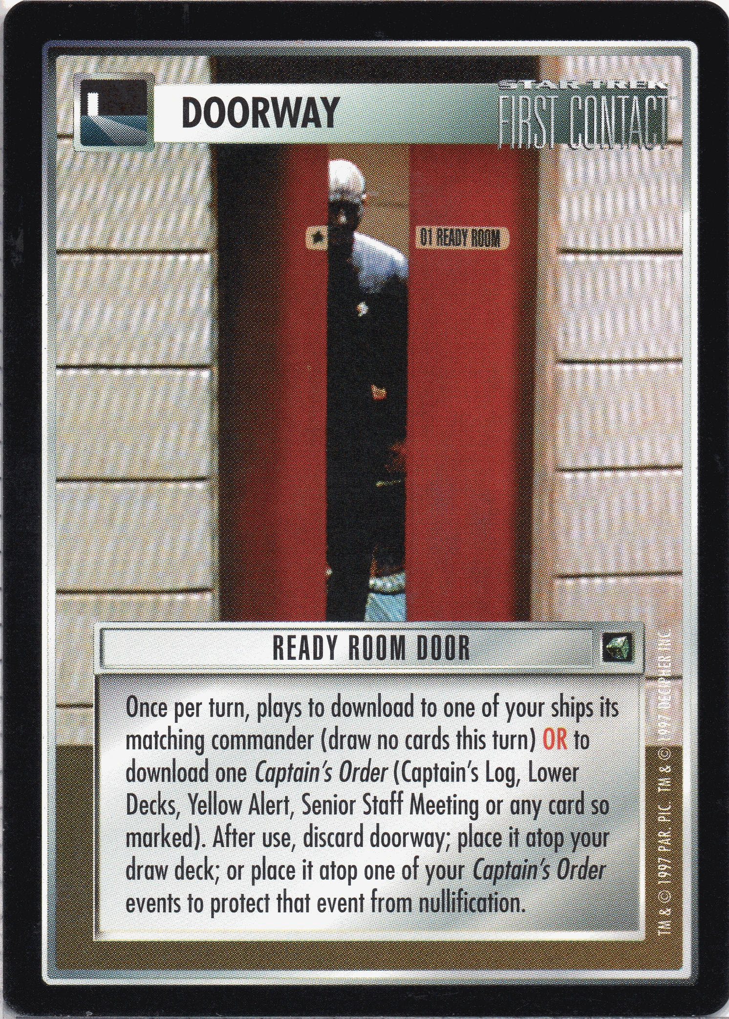 | Game Text (Errata) | Once per turn, plays to download to one of your ships its matching commander (draw no cards this turn) OR to download one Captain's Order (Captain's Log, Lower Decks, Yellow Alert, Senior Staff Meeting or any card so marked). After use, discard doorway; place it atop your draw deck; or place it atop one of your Captain's Order events to protect that event from nullification. |