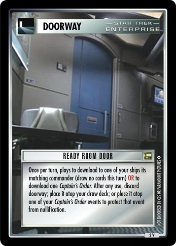 | Game Text | Once per turn, plays to download to one of your ships its matching commander (draw no cards this turn) OR to download one Captain's Order. After any use, discard doorway; place it atop your draw deck; or place it atop one of your Captain's Order events to protect that event from nullification. |