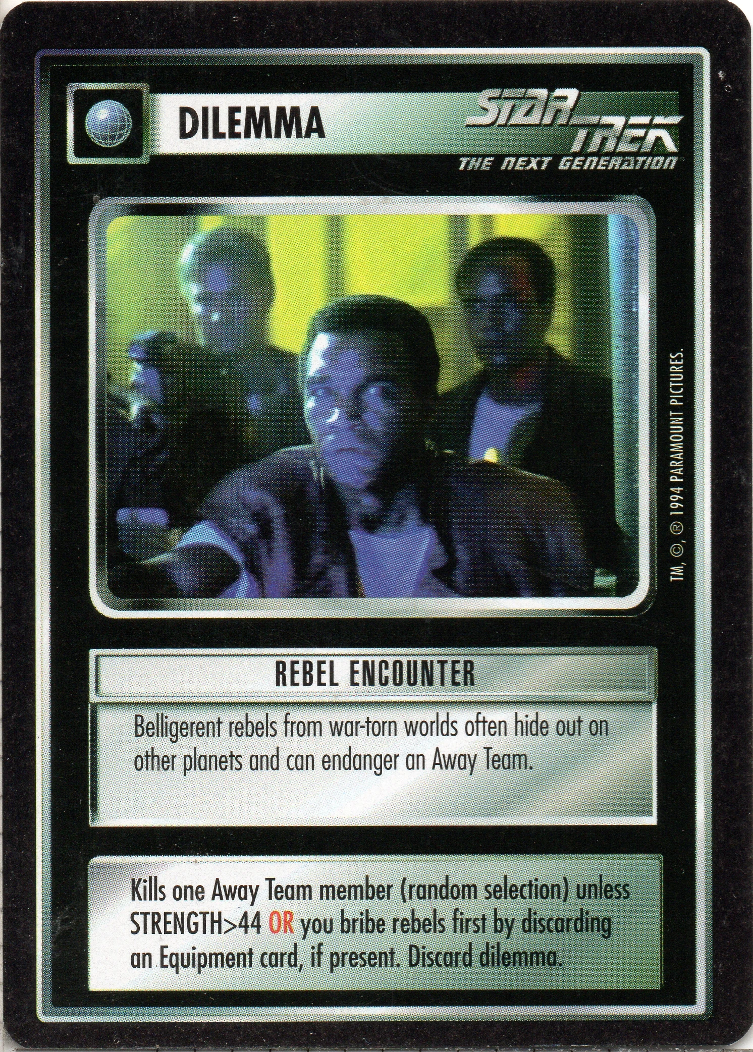 | Game Text | Kills one Away Team member (random selection) unless STRENGTH>44 OR you bribe rebels first by discarding an Equipment card, if present. Discard dilemma. |