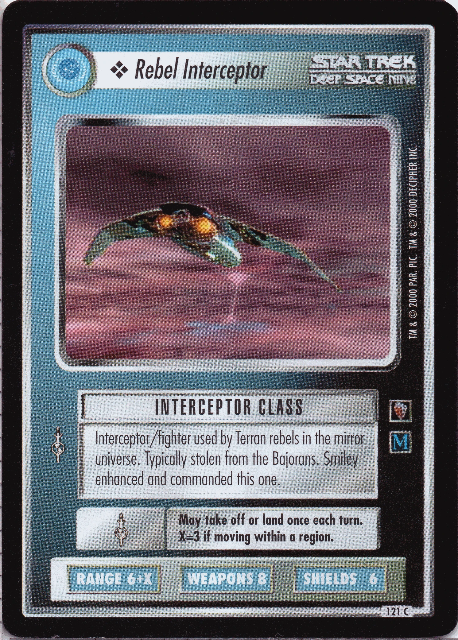| Lore | Interceptor/fighter used by Terran rebels in the mirror universe. Typically stolen from the Bajorans. Smiley enhanced and commanded this one. |
