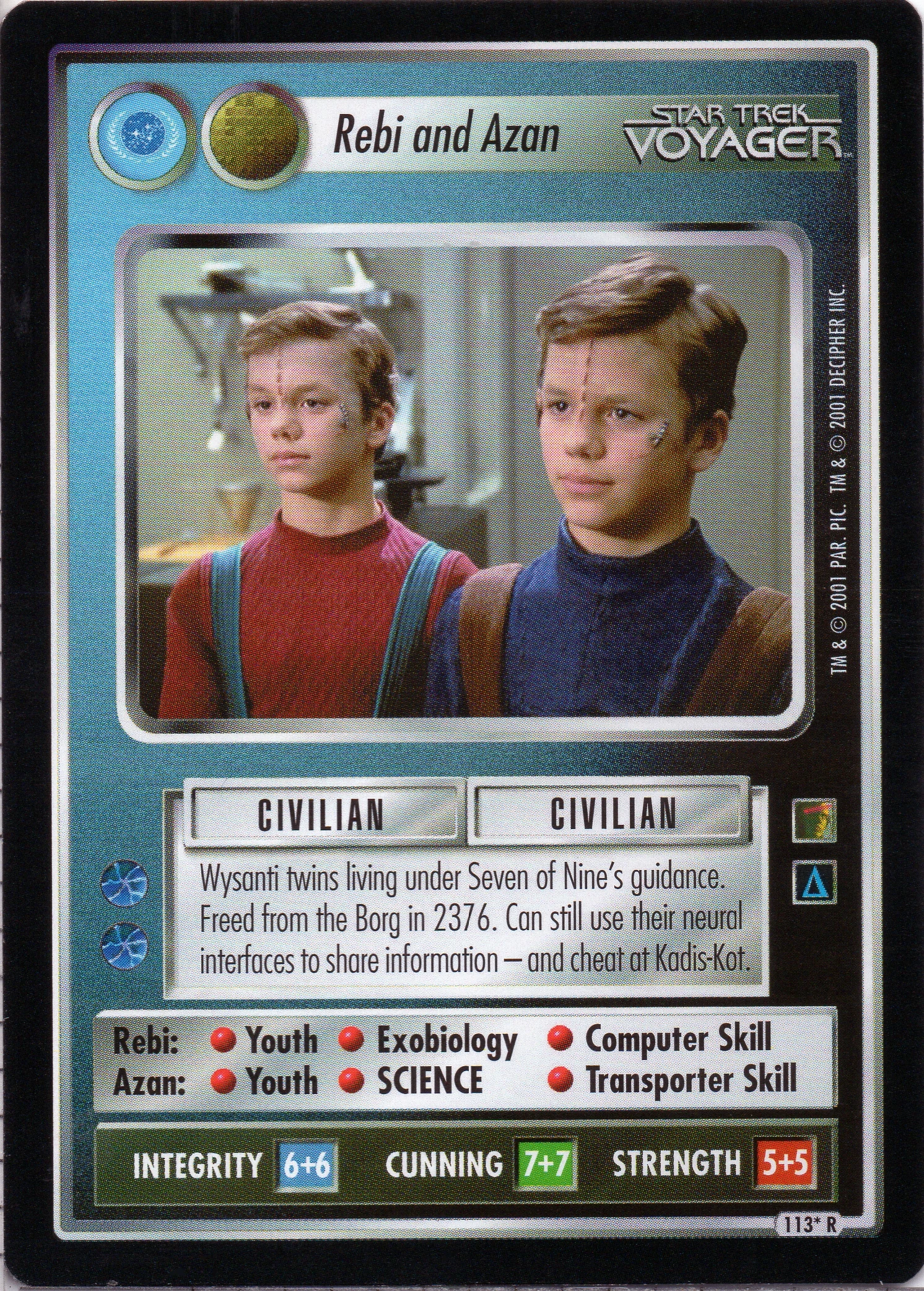 | Lore | Wysanti twins living under Seven of Nine's guidance. Freed from the Borg in 2376. Can still use their neural interfaces to share information – and cheat at Kadis-Kot. |