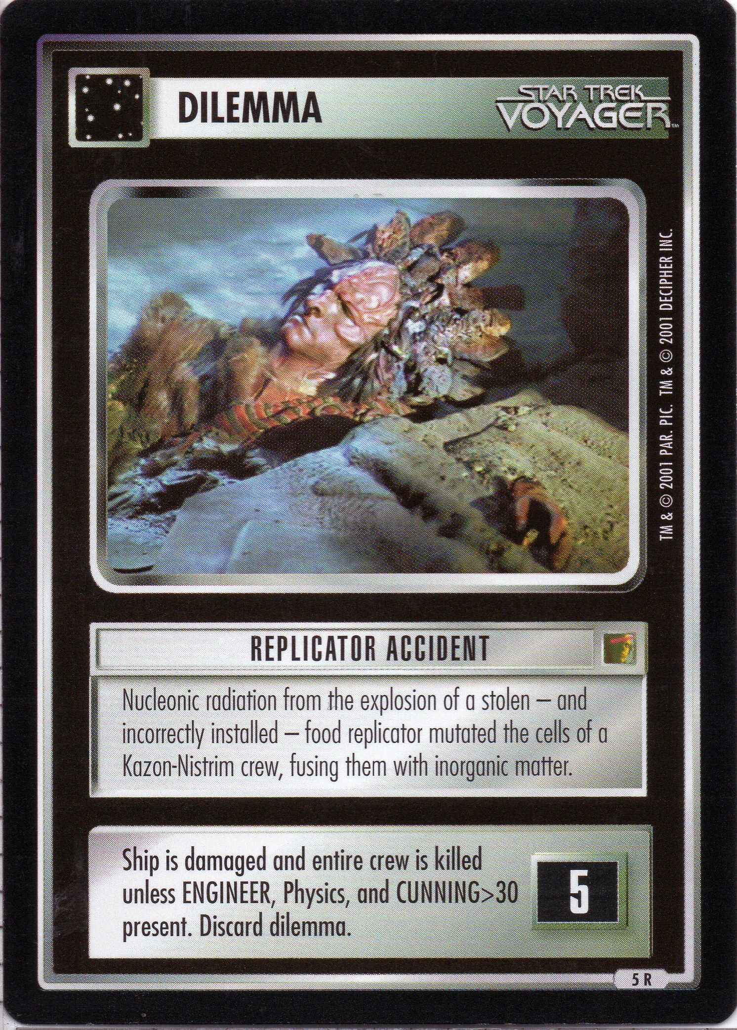 | Resolution Guide | If crew meets conditions (ENGINEER, Physics, and CUNNING>30), score points; move dilemma to bonus point area. Mission continues. Otherwise, ship damaged (and stopped) and crew killed. (Personnel in stasis, stopped, disabled or otherwise removed from attempting crew but still aboard ship are not killed.) Discard dilemma. |