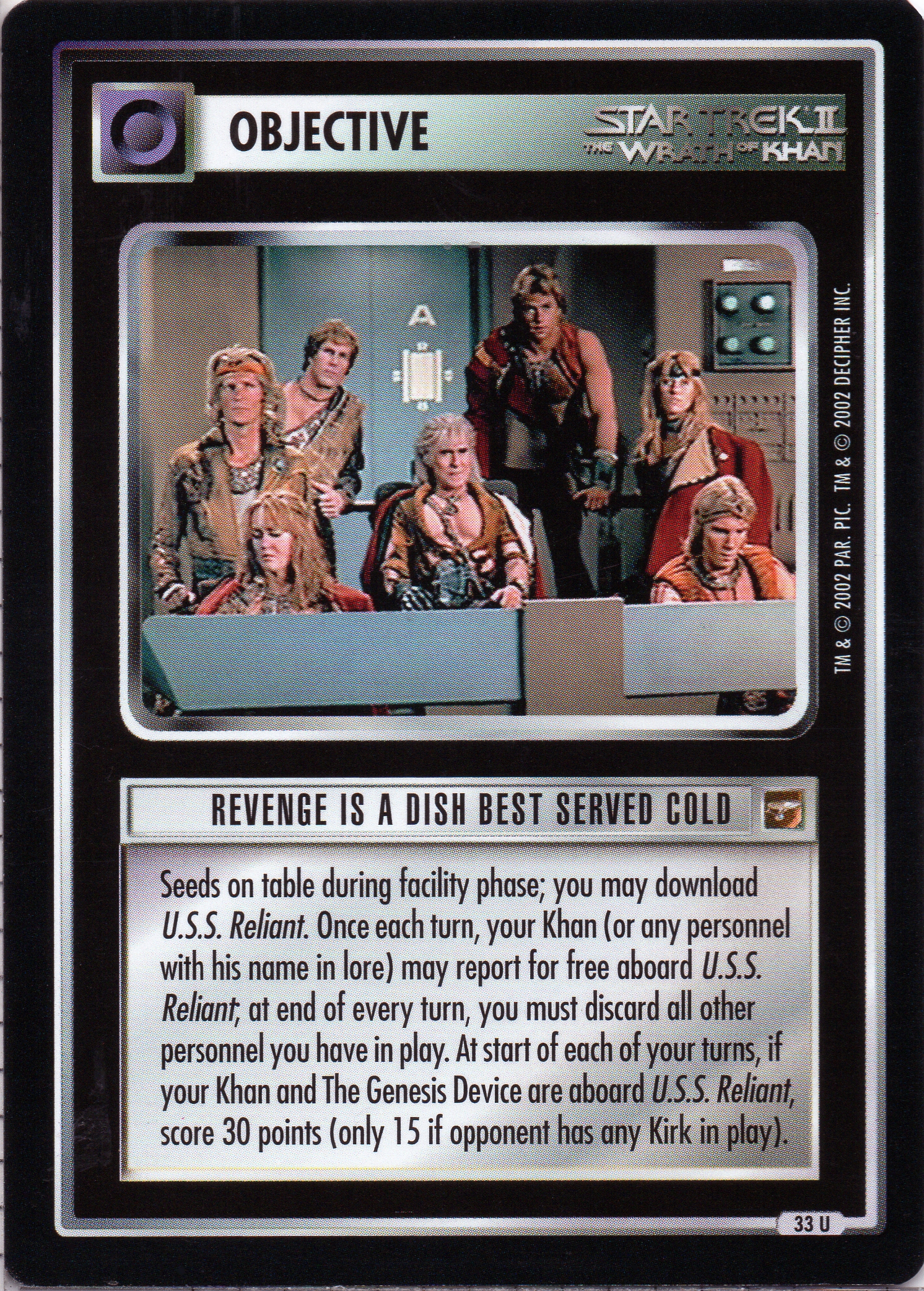 | Game Text (Errata) | Seeds on table during facility phase; you may download U.S.S. Reliant. Once each turn, your Khan (or any personnel with his name in lore) may report for free aboard U.S.S. Reliant, at end of every turn, you must discard all other personnel you have in play. At start of each of your turns, if your Khan and The Genesis Device are aboard U.S.S. Reliant, score 30 points (only 15 if opponent has any Kirk in play). |