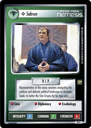 | Lore | Representative of the many senators navigating the perilous and delicate political landscape on Romulus. Seeks to better the Star Empire for his two sons. |