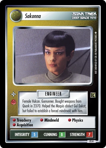 | Lore | Female Vulcan. Gunrunner. Bought weapons from Quark in 2370. Helped the Maquis abduct Gul Dukat, but failed to establish a forced mindmeld with him. |