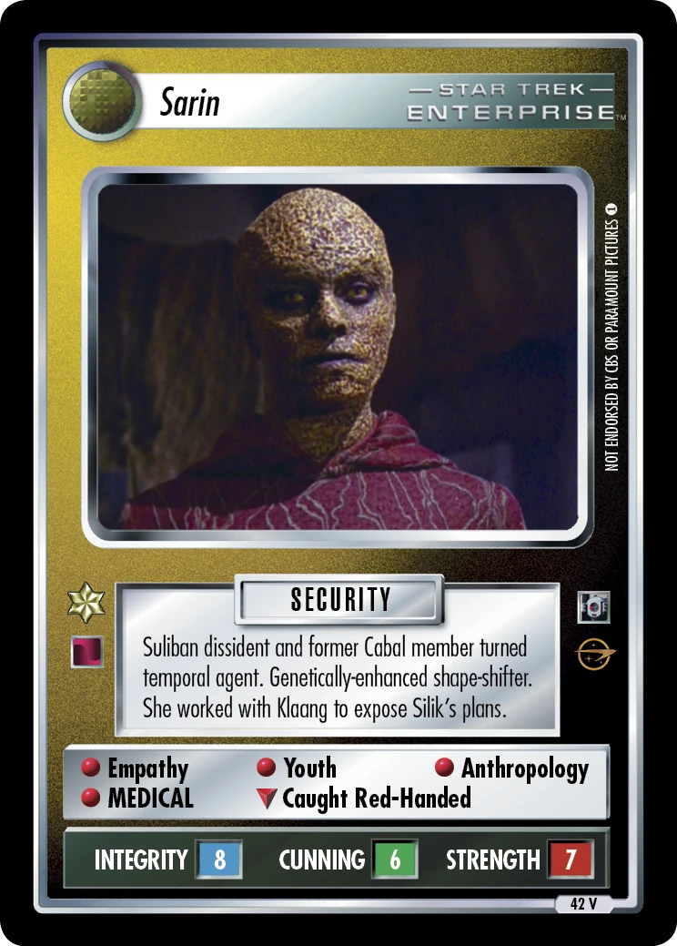 | Lore | Suliban dissident and former Cabal member turned temporal agent. Genetically-enhanced shape-shifter. She worked with Klaang to expose Silik's plans. |