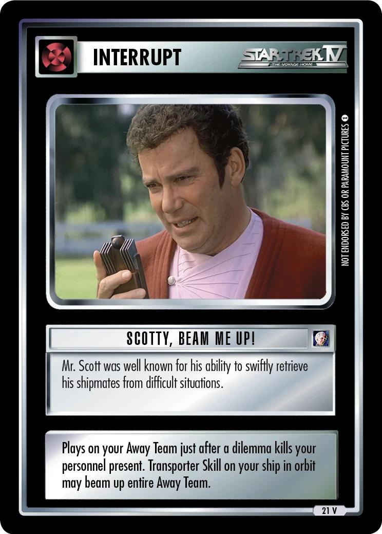 | Game Text | 'Plays on your Away Team just after a dilemma kills your personnel present. Transporter Skill on your ship in orbit may beam up entire Away Team. |