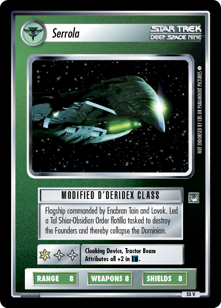 | Lore | Flagship commanded by Enabran Tain and Lovok. Led a Tal Shiar-Obsidian Order flotilla tasked to destroy the Founders and thereby collapse the Dominion. |