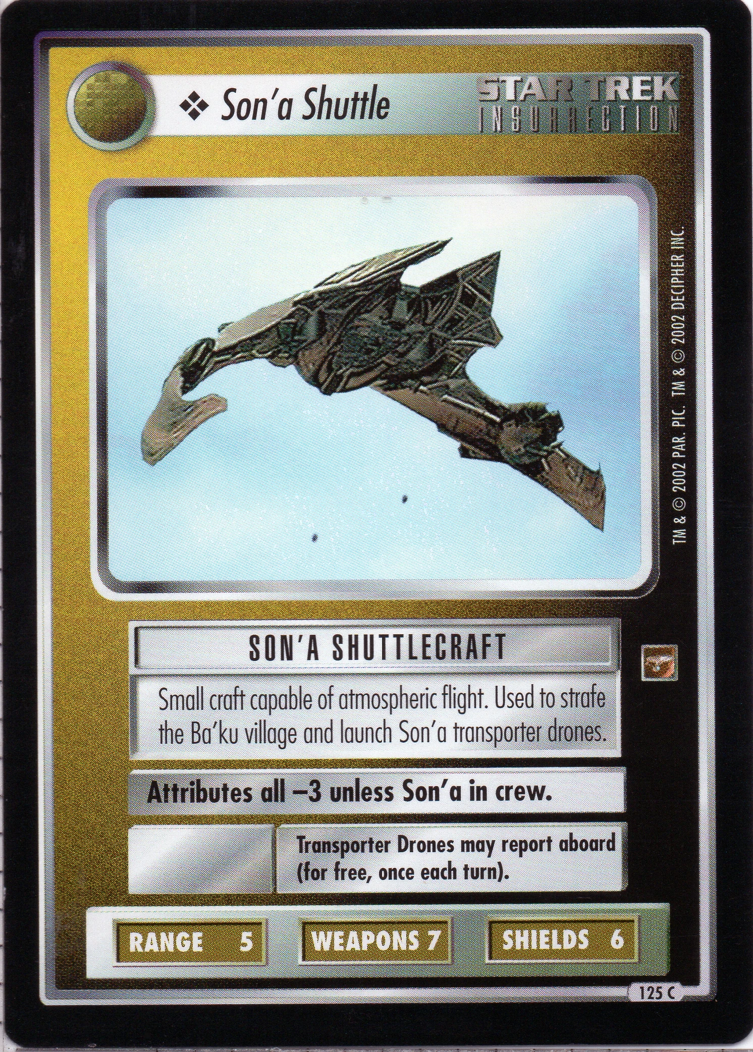 | Characteristics | Capturing-related card, Shuttlecraft, Son'a ship |