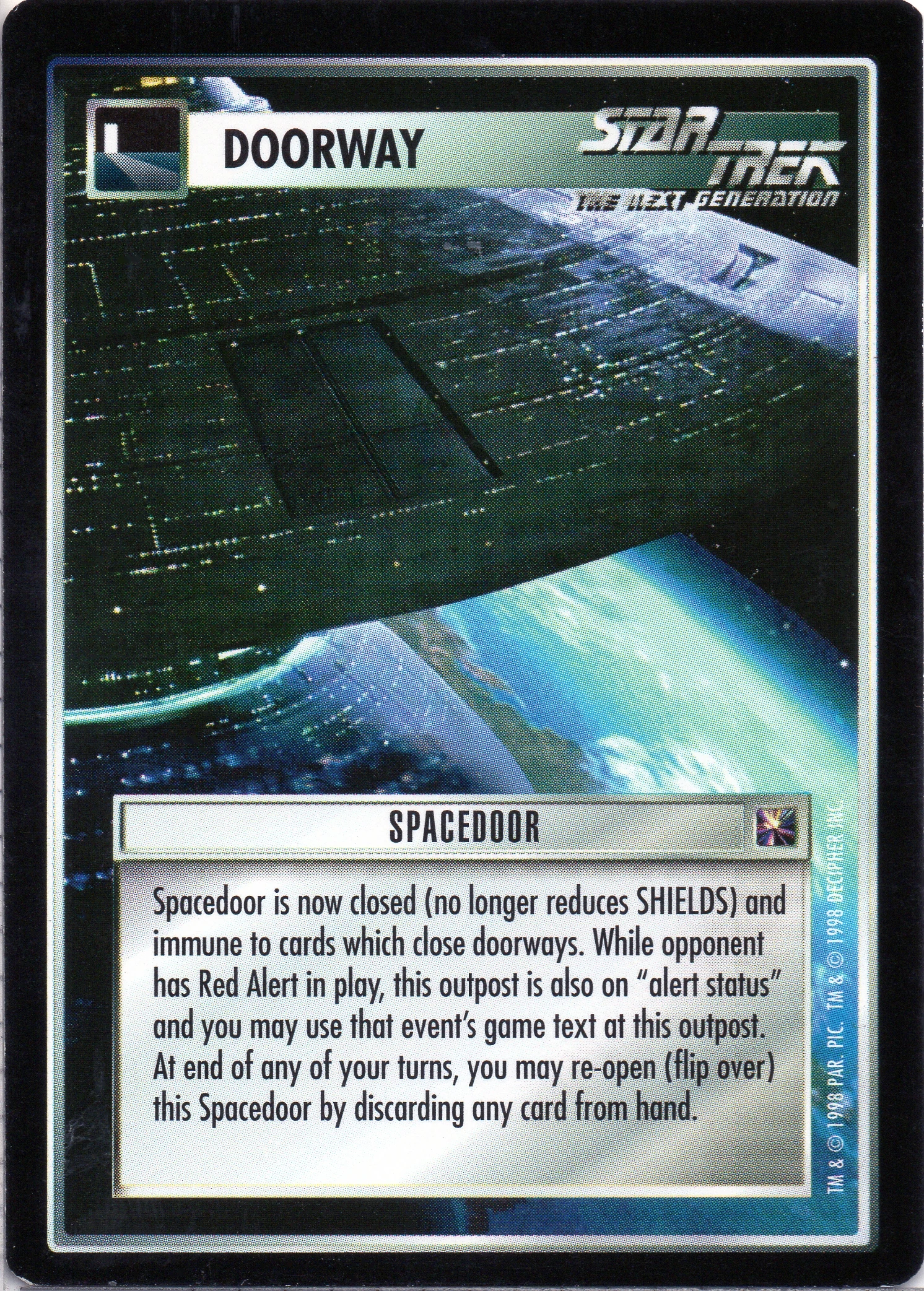 | Game Text (Errata) | Seeds on your outpost during outpost phase. Spacedoor is now open, reducing outpost's SHIELDS by 8 (cumulative). In place of your normal card play, you may either "overhaul" one of your empty ships here (return to ship to hand; nullifies any Static Warp Bubbles affecting you) OR download to here one Spacedock or |