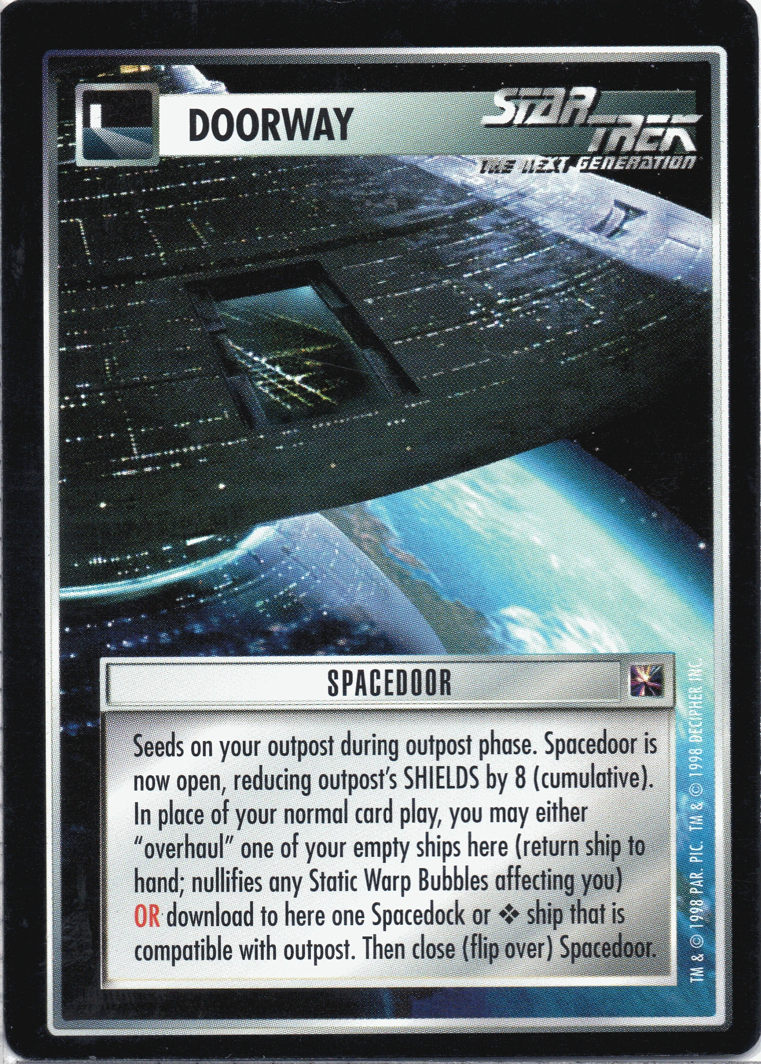 | Game Text (Errata) | Spacedoor is now closed (no longer reduces SHIELDS) and immune to cards which close doorways. While opponent has Red Alert in play, this outpost is also on "alert status" and you may use that event's game text at this outpost. At end of any of your turns, you may re-open (flip over) this Spacedoor by discarding any card from hand. |