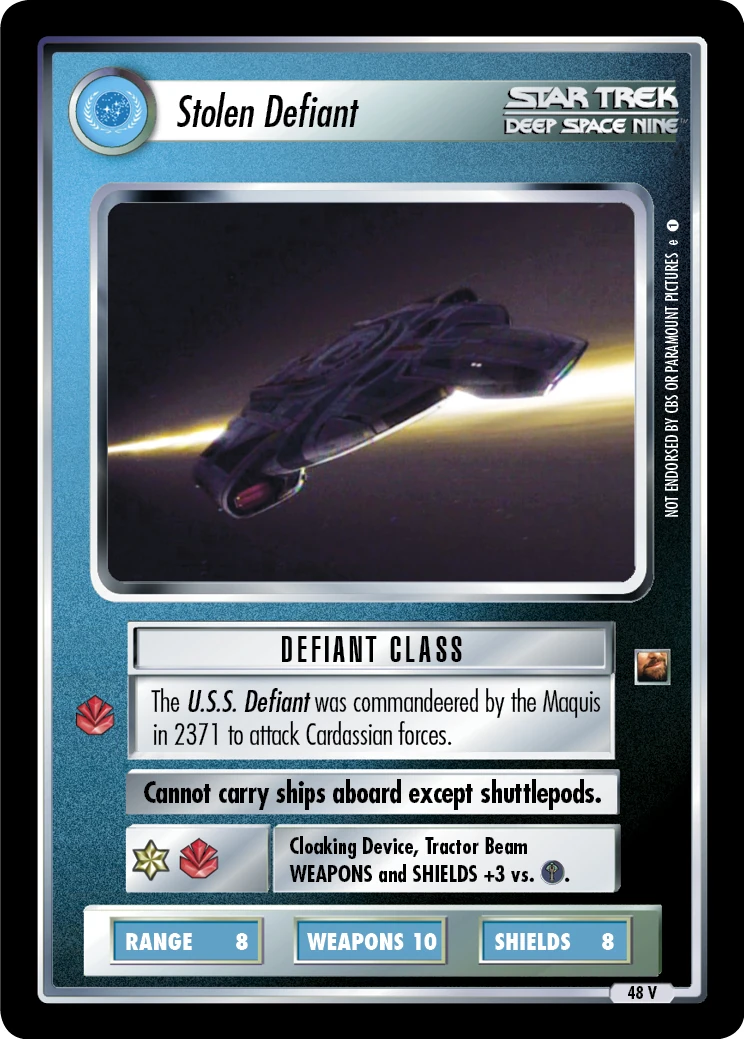 | Lore | The U.S.S. Defiant was commandeered by the Maquis in 2371 to attack Cardassian forces. |
