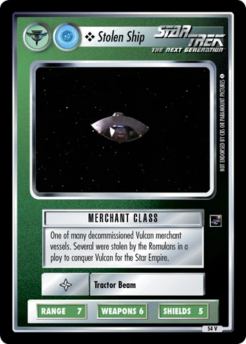 | Lore | One of many decommissioned Vulcan merchant vessels. Several were stolen by the Romulans in a ploy to conquer Vulcan for the Star Empire. |