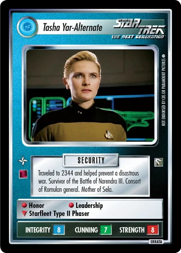| Lore | Traveled to 2344 and helped prevent a disastrous war. Survivor of the Battle of Narendra III. Consort of Romulan general. Mother of Sela. |