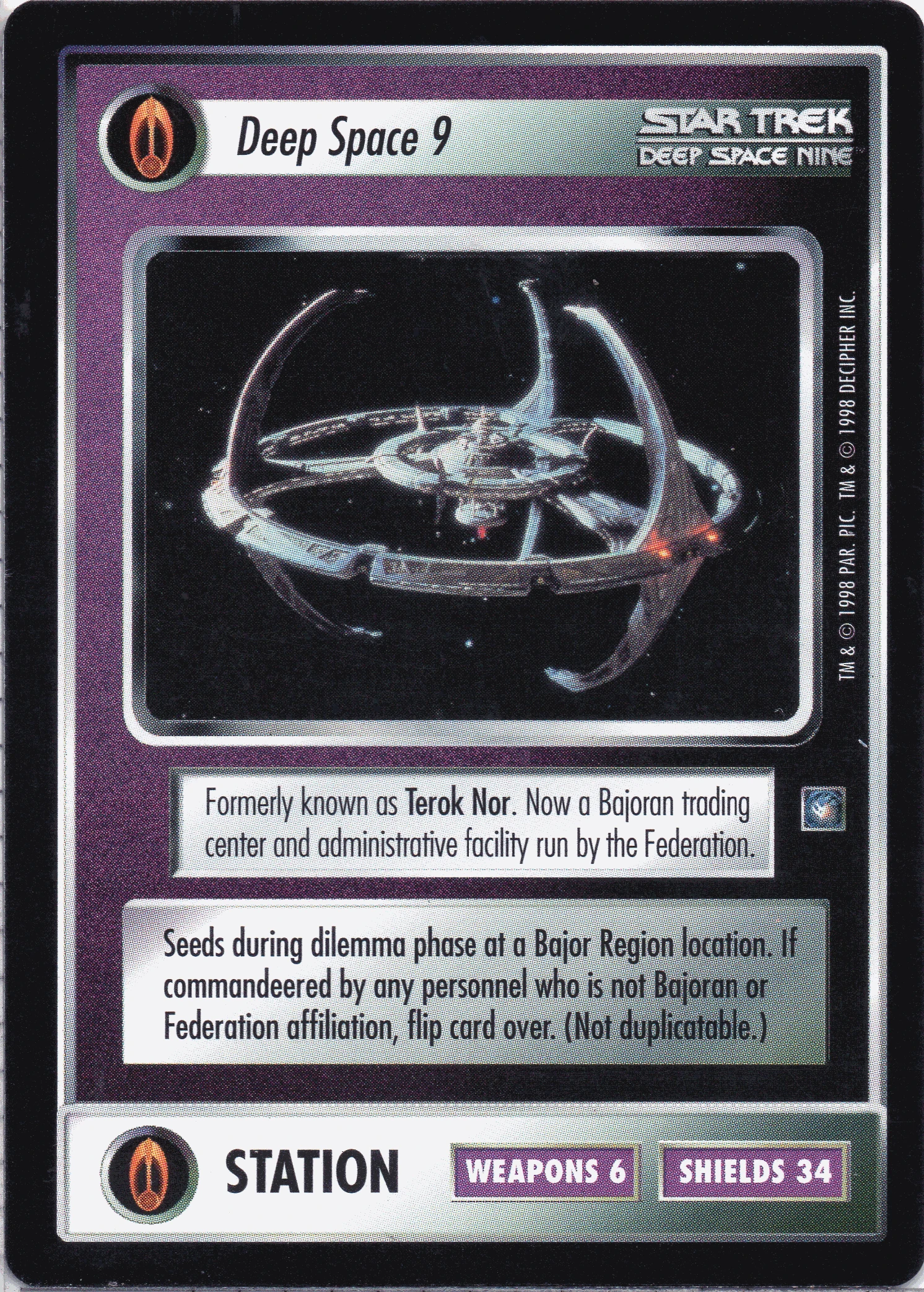 | Game Text (Errata) | Seeds at Bajor Region location. If commandeered by any personnel who is Bajoran or Federation affiliation, flip card over. (Not duplicatable.) |