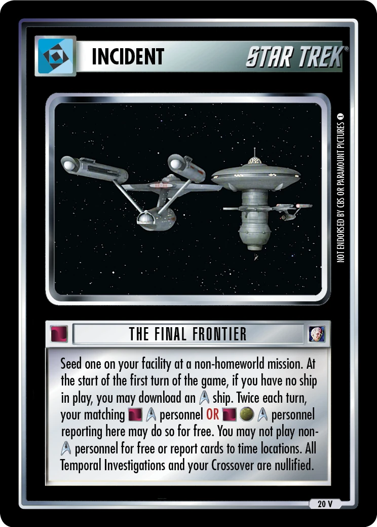 Seed one on your facility at a non-homeworld mission. At the start of the first turn of the game, if you have no ship in play, you may download an |