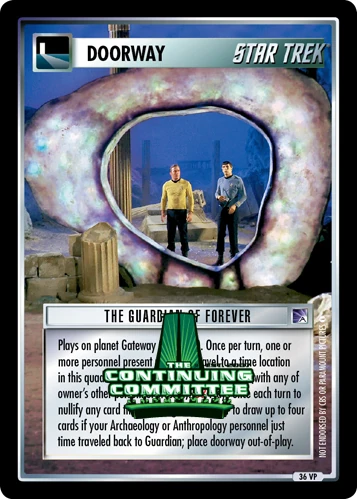 | Game Text | Plays on Gateway (limit one). Once per turn, one or more personnel present may time travel to a time location in this quadrant, or may return here from there (with any of owner's other personnel present). OR Plays once each turn to nullify any card that is closing Guardian, or to draw up to four cards if your Archaeology or Anthropology personnel just time traveled back to Guardian; place doorway out-of-play. |